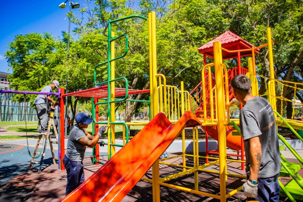 El operativo, que estuvo a cargo de personal de la Secretaría de Espacio Público, implicó trabajos de lijado y pintura tanto en los juegos como en el mobiliario de hormigón y en las barandas de acceso.