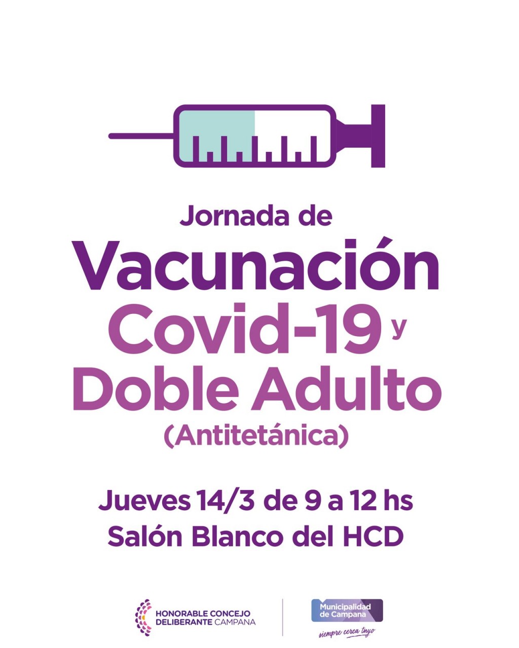 El operativo organizado por la Secretaría de Salud del Municipio y el Concejo Deliberante se extenderá de 9 a 12 en el Salón Blanco. Se aplicarán vacunas para prevenir el Coronavirus y la antitetánica a mayores de 12 años.