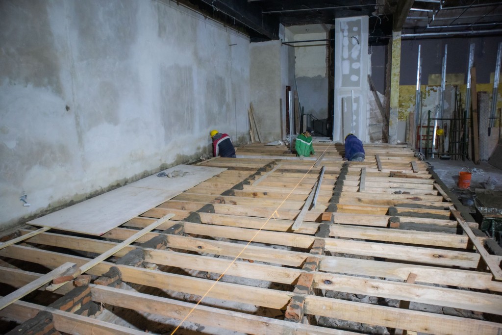 Y, luego de terminar la construcción de la cabina de proyección, se realizan trabajos en la zona del foyer y el acceso a la nueva boletería.