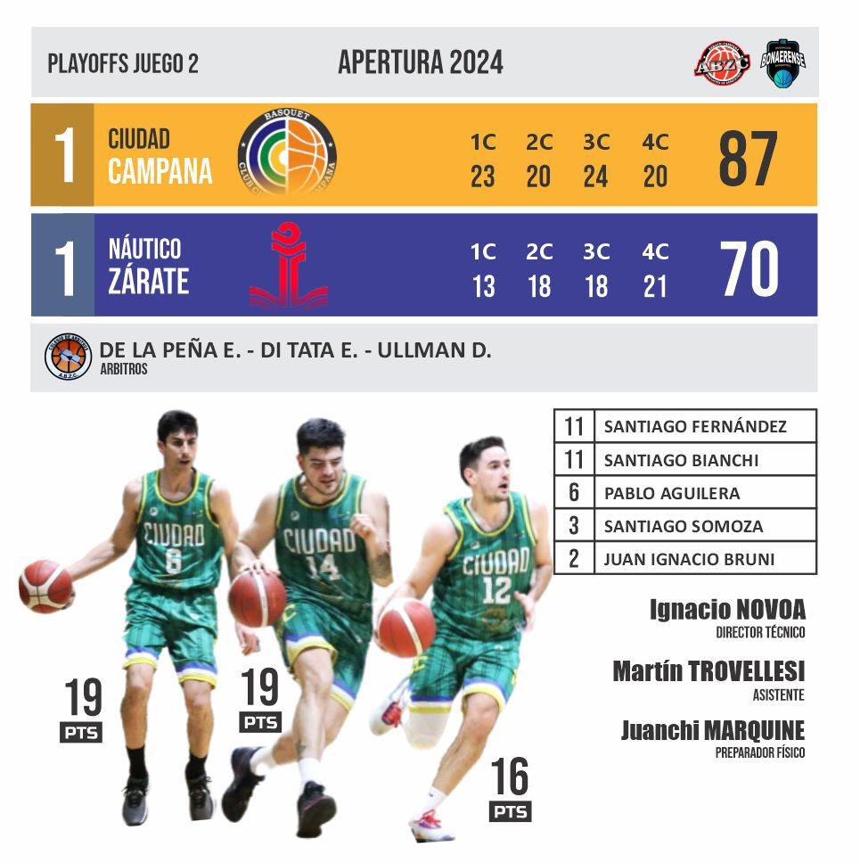 Un primer cuarto con 17 puntos de Matías Nieto y la diferencia inicial de 10 puntos le permitió al "tricolor" mantener esa diferencia y llevar el segundo y tercer cuarto para conseguir una amplia victoria que le permite ir a un tercer juego en Zárate.