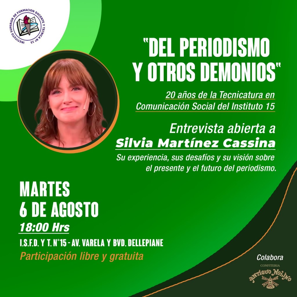 Con motivo de los festejos por el vigésimo aniversario de la carrera de Comunicación Social que se dicta en el Instituto Superior de Formación Docente y Técnica nº 15 de Campana, el martes 6 de agosto a las 18 se realizará en la institución (av. Varela y el boulevard Dellepiane), una entrevista abierta con la periodista Silvia Martínez Cassina: “Del periodismo y otros demonios. Su experiencia, sus desafíos y su visión sobre el presente y el futuro del periodismo”. La charla es abierta a la comunidad y con entrada libre y gratuita.