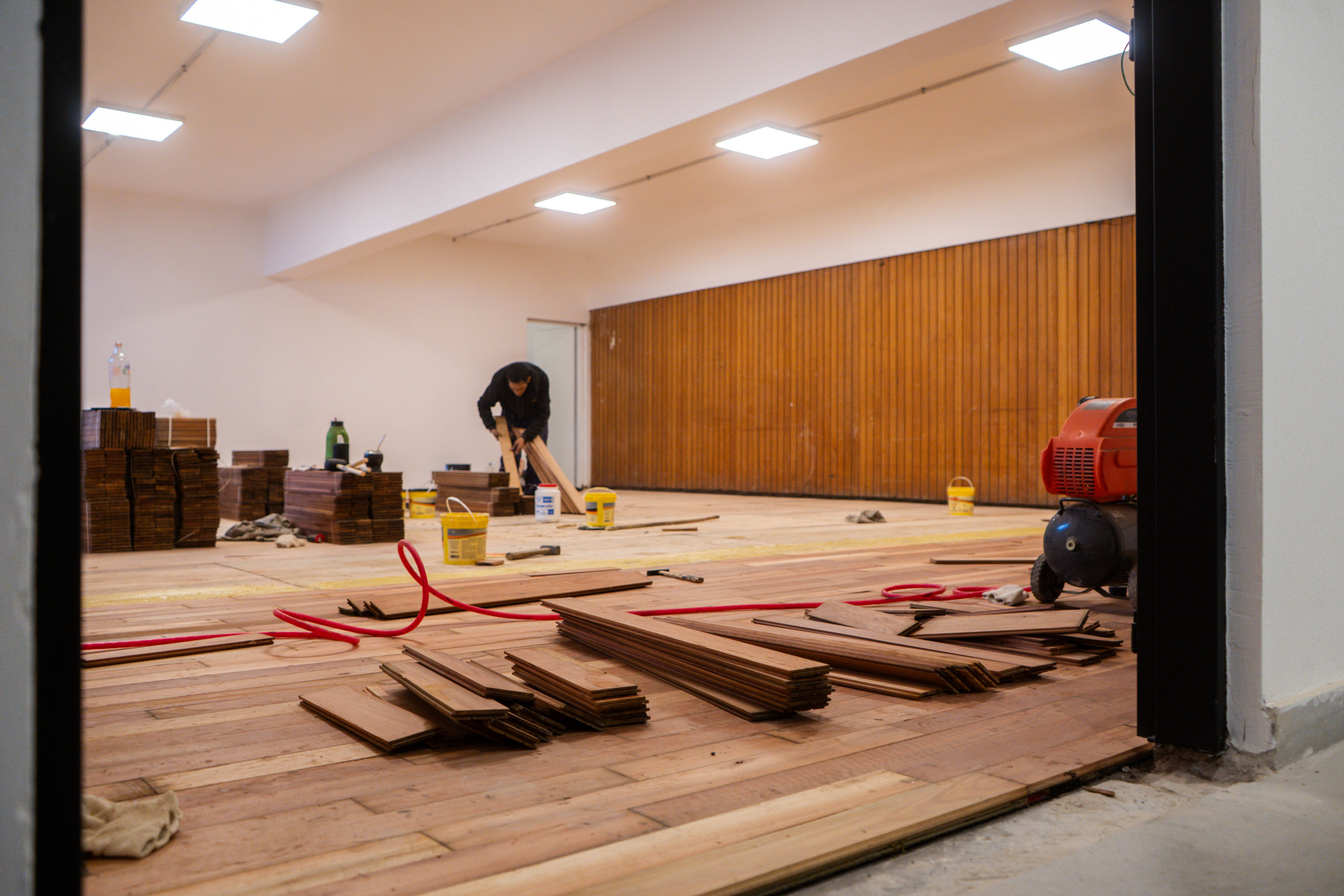 En el subsuelo se realiza el cambio del piso de madera; mientras que, en la sala principal, se lleva adelante las terminaciones de los laterales de las paredes y el armado del cielorraso. Previo a estos trabajos, se finalizó la instalación del techo de vidrio del hall de acceso al teatro.