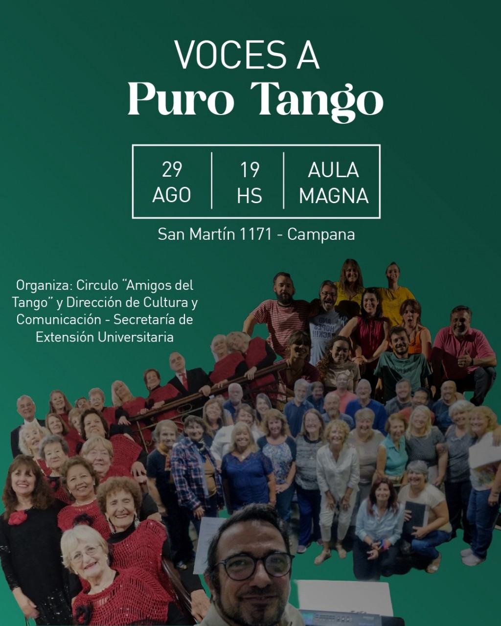 “Voces a puro Tango” es una propuesta cultural que promete emocionar y conmover al público con la interpretación de grandes clásicos del género. En esta oportunidad, subirán al escenario destacados artistas locales, como el Coro Municipal de Campana (dirigido por el maestro Antonio Stcherbina), “Honrando la Vida” (bajo la dirección de Mary De Los Santos), el Coro de la Facultad Regional Delta (a cargo del maestro Juan Carlos Nos) y La Cata Grupo Vocal (bajo la dirección de Augusto Pérez Thomsen). Además, reconocidos solistas como Juan Laplacette, Flavio Ronzani, Ofelia Diaz, Daniel Casado, Osvaldo Galeano y Alejandro Palacios deleitarán al público con sus voces.