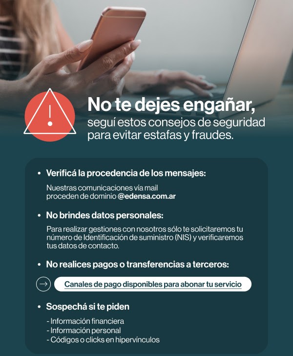 Además, la distribuidora recalca que en ningún caso solicita datos que no estén relacionados con el suministro eléctrico, y que todas las comunicaciones sobre cortes programados se realizan a través del correo electrónico, web y Redes Sociales de la empresa, sin que haya diálogo directo. Asimismo, la empresa no ofrece el servicio de inscripción al Registro de Acceso a los Subsidios de Energía (RASE), que en todos los casos debe ser realizado por el usuario con sus datos personales. Por último, sugieren prestar atención a la verificación del WhatsApp (tilde verde junto a “EDEN”) para identificar el canal legítimo de la compañía.