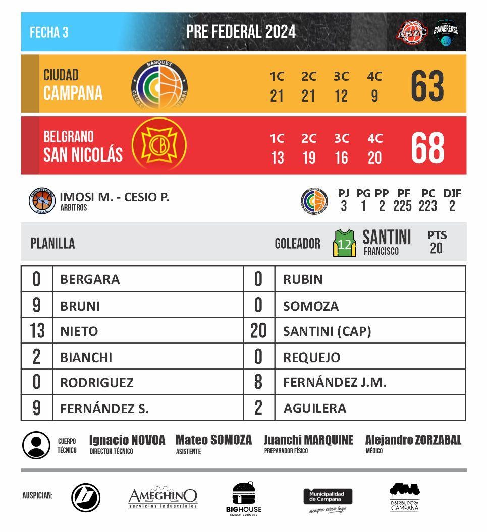 Los parciales fueron 21-13, 21-19, 12-16 y 9-20 y Belgrano de San NIcolás mostró mejor respuesta física en el cierre del juego. Ciudad de Campana tuvo un gran primer tiempo pero no logró sostenerlo en el segundo tiempo, Matías Nieto fue la figura en el parcial de 42 a 32 con 13 puntos pero no repitió en el tercer y cuarto cuarto donde no logró convertir. El goleador del Ciudad fue Francisco Santini con 20 puntos.