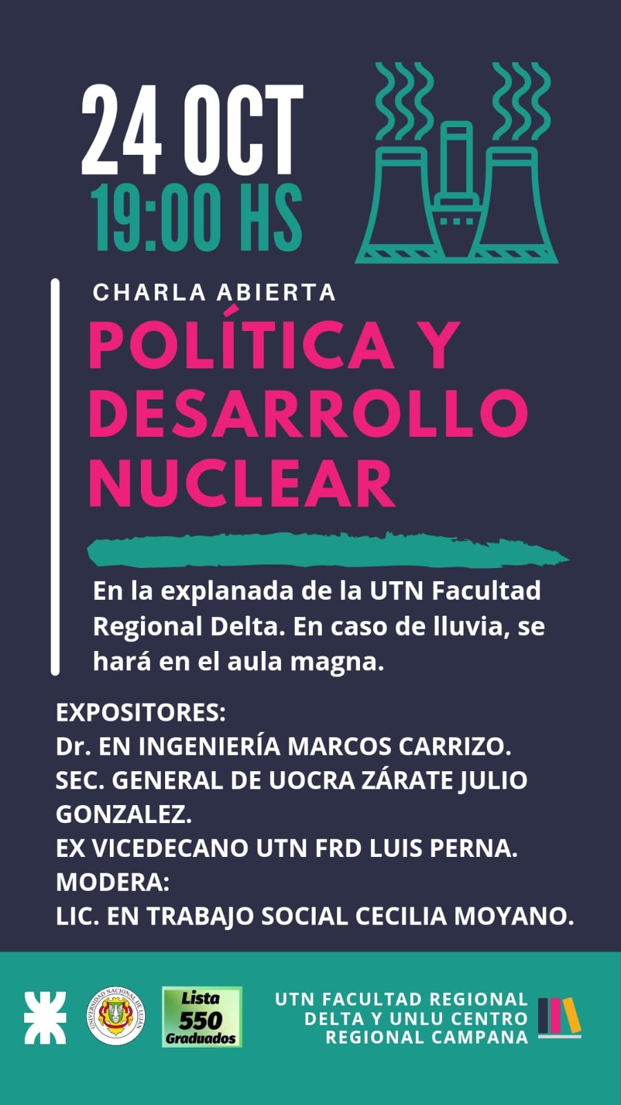 Jornada de visibilización CHARLA ABIERTA “POLITICA Y DESARROLLO NUCLEAR” EN LA EXPLANADA DE LA UTN FACULTAD REGIONAL DELTA