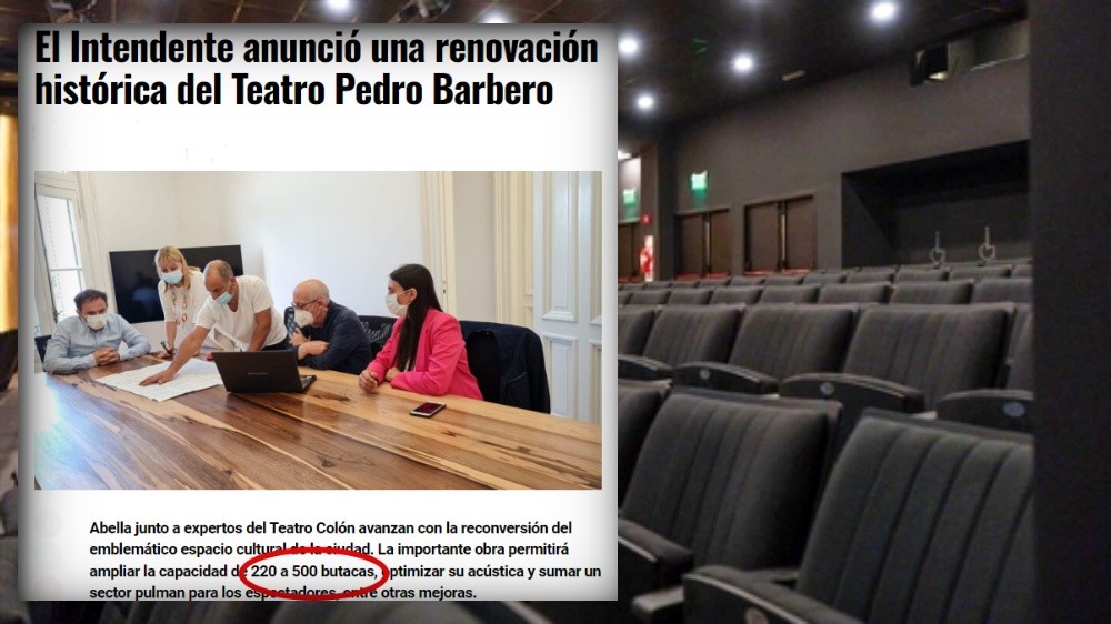 No obstante, agregó que, pese a que el Intendente había anunciado la ampliación de la capacidad a 500 butacas, finalmente solo se colocaron 238. "En Octubre de 2019, el Intendente anunció el inicio de la remodelación total del Teatro Municipal Pedro Barbero, ampliando la capacidad de 223 a 368 lugares. Posteriormente, en Enero de 2022, se convocó a expertos del Teatro Colón donde se avanzó con la planificación de las obras, anunciando que se ampliaría la capacidad de 220 a 500 butacas. Hasta que en Mayo de 2022, finalmente el Teatro bajó el telón para iniciarse el proceso de remodelación" sostuvo en el proyecto.
