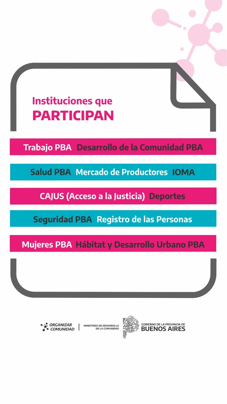 Según detallaron desde la organización, los servicios disponibles serán: Registro de las Personas (Trámite de DNI), Desarrollo de la Comunidad, Ministerio de Trabajo, Salud PBA, Mercado de Productores, IOMA, Centro de Acceso a la Justicia, Deportes, Seguridad PBA, Mujeres PBA y Hábitat y Desarrollo Urbano PBA.