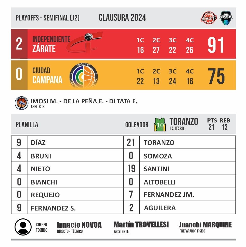 El "tricolor" perdió en Zárate y la serie se cerró en favor de Independiente que se convirtió en finalista del Torneo de la A.B.Z.C por 2 a 0 al vencerlo por 91 a 75.