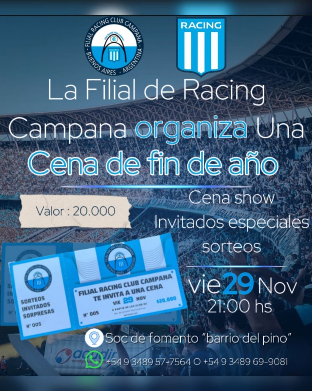 En la Sociedad de Fomento del Barrio Del Pino se realizará la cena con invitados especiales este viernes 29 de Noviembre, el costo de la tarjeta es de $ 20000.- y se pueden reservar a los celulares 3489-57-7564 o 3489-69-9081 y será el momento ideal para festejar la obtención de la Copa Sudamericana.
