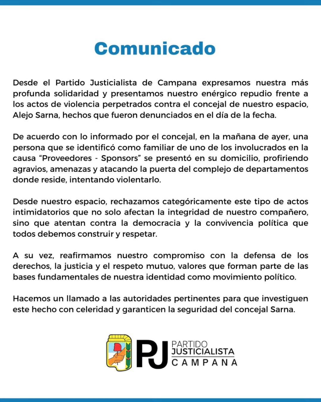 El P.J emitió un comunicado por agresiones al concejal Sarna