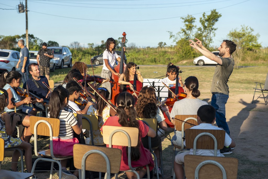 Junto a la Orquesta Escuela, los músicos deleitaron a los vecinos del barrio con un amplio repertorio de canciones, utilizando sus instrumentos de cuerda, viento y percusión.