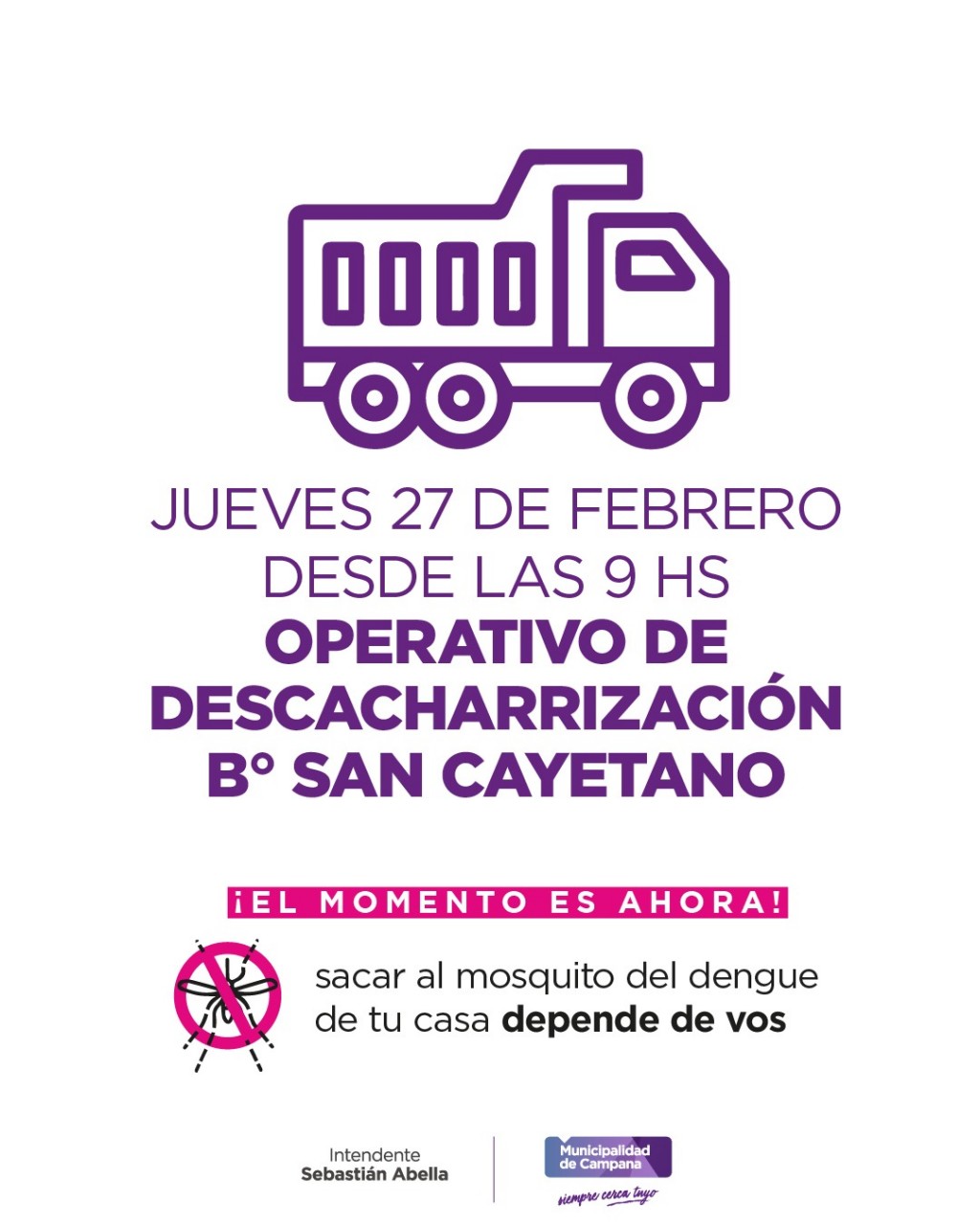Este jueves 27 de febrero, el Municipio realizará un nuevo operativo de descacharrización en San Cayetano, en el marco de las acciones para prevenir el Dengue.